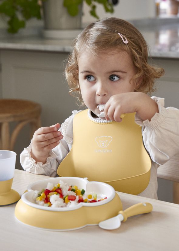 ベビービョルンの人気キッチンアイテム5点(ベビースタイ・ベビープレート・スプーン・フォーク・ベビーカップ)をひとつにまとめたディナーセット。専用ボックス入りで、出産祝いや誕生日ギフトにもそのまま贈れます。食洗機対応、BPAフリー・PVCフリーで、はじめてのお食事デビューにも安心です。